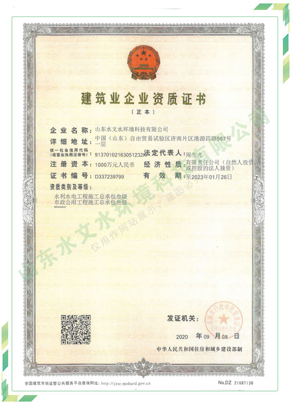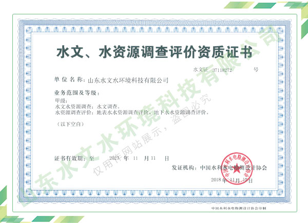 公司擁有水利工程設(shè)計、水土保持、水文水資源調(diào)查評價、水資源論證、建設(shè)項目環(huán)境影響評價、市政公用工程施工總承包、水利水電工程施工總承包、電子與智能化工程專業(yè)承包等資質(zhì),2017年通過質(zhì)量管理體系、環(huán)境管理體系、職業(yè)健康安全管理體系認證;2020年被評為國家級高新技術(shù)企業(yè),同年被中國水利企業(yè)協(xié)會推薦為第一批“合同節(jié)水服務(wù)企業(yè)”;2021年被山東省、濟南市評為 “專精特新”中小企業(yè)。業(yè)務(wù)范圍涉及水利工程設(shè)計;節(jié)水設(shè)計、改造、水平衡測試;山洪災害調(diào)查;城市水資源調(diào)查評價;建設(shè)項目水土保持方案編制、監(jiān)測、驗收、水土保持規(guī)劃;水安全保障規(guī)劃、建設(shè)項目水資源論證、規(guī)劃水資源論證;建設(shè)項目環(huán)境影響評價;入河排污口論證;防洪影響評價;市政公用工程施工、水利水電工程施工、電子與智能化工程施工等。